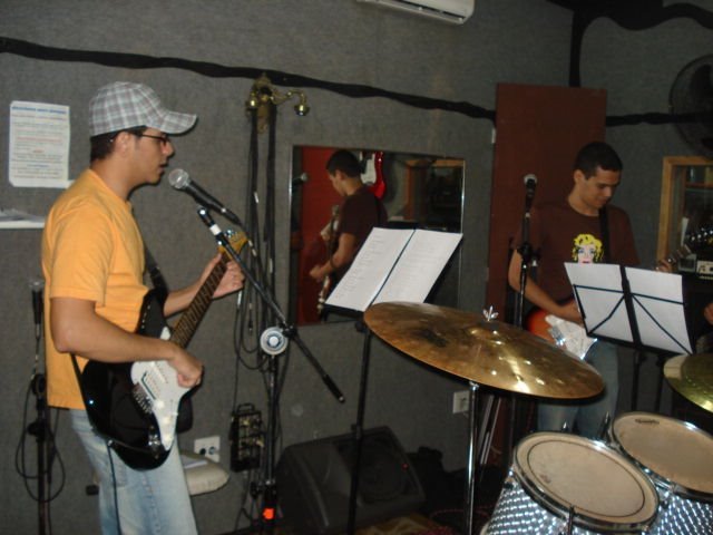 Guitarrista na banda 5 Pilas, também composta por Felipe Garcia (guitarra, voz), Gabriel Moraes (bateria) e Tarcízio Brasil (baixo) | 2010 | Registro fotográfico de um dos ensaios da banda