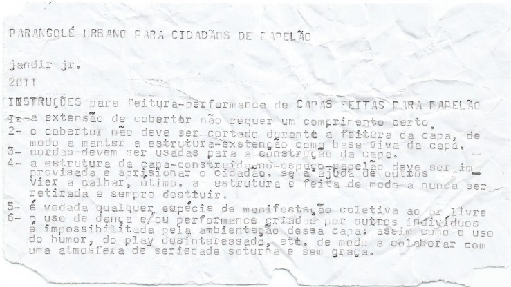 Parangolé urbano para cidadãos de papelão | 2011 | Papel datilografado | 17,5 x 10 cm. | Inspirado no texto INSTRUÇÕES para feitura-performance de CAPAS FEITAS NO CORPO, de Helio Oiticica