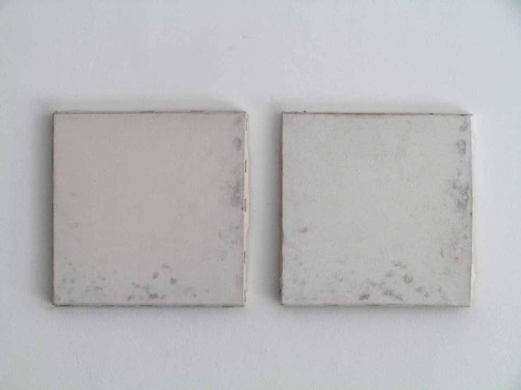 Sem título | 2012 | Díptico – Da esquerda para a direita: tela com manchas de mofo e grafite sobre tela | 20 x 20 cm. cada
