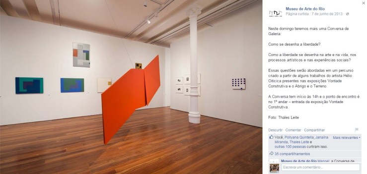 Como se desenha a liberdade? | 2013 | Conversa de galeria realizada no Museu de Arte do Rio | Imagem de Printscreen do site http://facebook.com