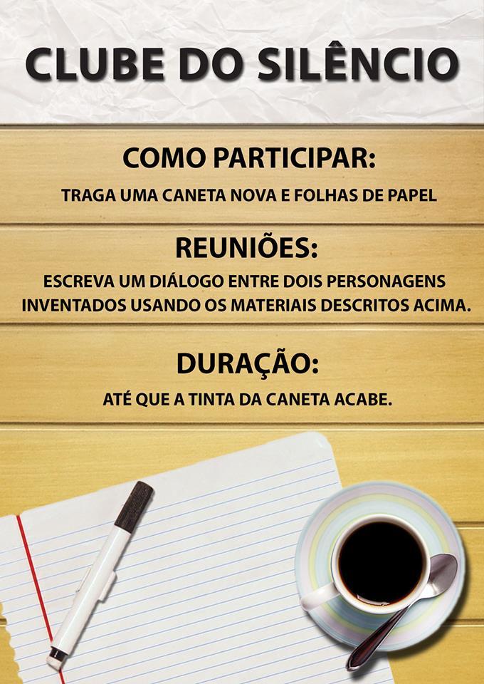 Contratei um designer que desconhecia para que fizesse a identidade visual para este panfleto com as instruções do Clube do silêncio, escritas por mim. Distribui os panfletos em diversas regiões do Rio de Janeiro entre meados de 2013 até o dia 27 de Outubro de 2014, um dia após o segundo turno das eleições presidenciais.