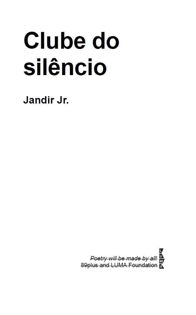Publicação concebida mediante um convite para a exposição Poetry will be made by all, que ocorreu na LUMA/Westbau, em Zurique, Suíça, de Janeiro a Março de 2014. Essa exposição, a primeira realizada pelo projeto 89 plus, co-curado por Hans Ulrich Obrist e Simon Castets, pretendeu realizar a publicação online e impressa de 1000 publicações feitas por autoras(es) nascidas(os) em ou depois de 1989 e oriundas(os) de 50 países espalhados pelos seis continentes. Por não ter sido publicada online minha submissão ao projeto/exposição, o que ocorreu com grande parte dos autores convidados, e pelo site http://poetrywillbemadebyall.ch/, que guardava o acervo publicado, ter saído do ar, disponibilizo-a de forma independente.