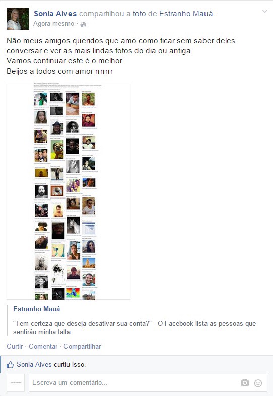 22/11/2014 — Fui olhar como se desativa a conta do Facebook. Eis que descubro que o site cria uma “chantagem emocional” ao colocar fotos de seus contatos e dizer que eles sentirão sua falta. Então fiz uma montagem “sutil” copiando algumas dessas fotos e criando a imagem abaixo, que coloquei como foto de capa: