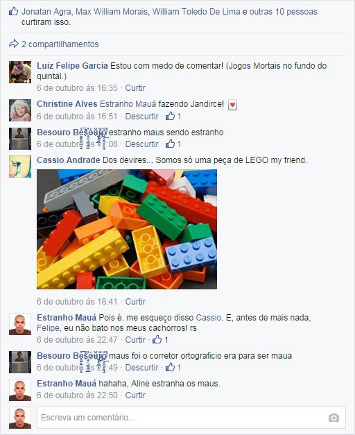Até que meus contatos têm interagido bastante com os testes que realizei, mas a ideia é que, pelo excesso de testes postados, esse número de intervenções diminua e o absurdo substitua todas as leituras possíveis sobre os atos por trás desses testes.