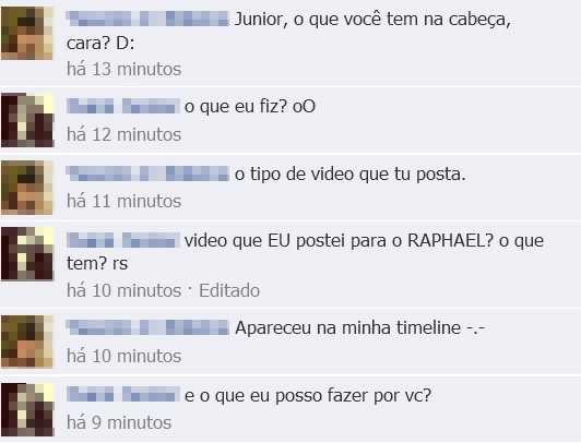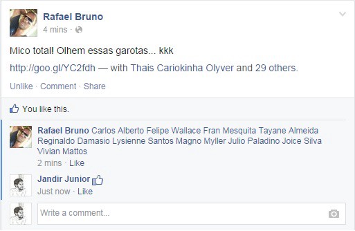 28/08/2014 — Postei outro link, agora com uma música que estava escutando (suja a roupa, mas lava a alma, do NDN). Porém, desta vez com uma diferença: em vez de escrever Garotas totalmente bêbadas pagando mico escrevi Gatoras totalmente bêdabas pagando mico (sim, invertendo algumas poucas letras no interior de algumas palavras). Resultado quantitativo: nenhuma curtida, estes comentários: