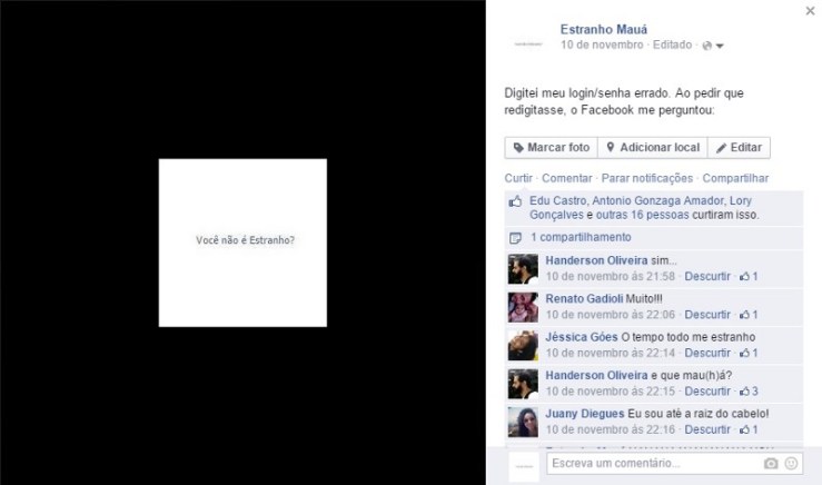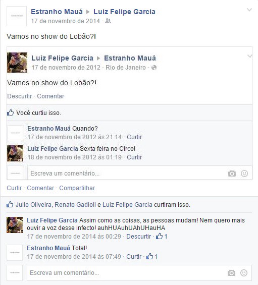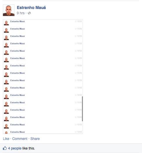 29/08/2014 — Encontrei ontem o Julio hoje e ele disse, em um tom algo sério, que estava preocupado por que tinham invadido meu Facebook, que tinha tentado me ligar e conversado até com o Renato sobre. Quando falei que eu mesmo estava por trás da contaminação ele falou algo e fez uma expressão que não conseguiria descrever com sucesso aqui (mas acho que ele estava me zoando muito, haha).