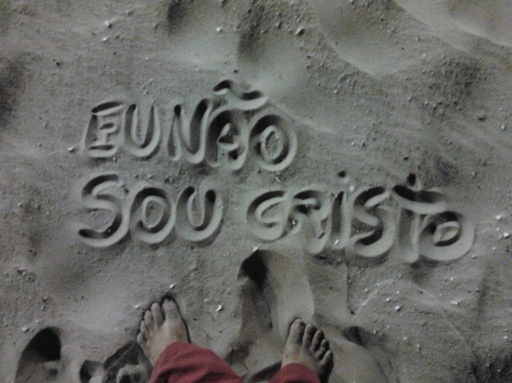 Publicado em 27.9.201425.12.2018 por Jandir Jr. Eu não sou Cristo | 2014 | Inscrição sobre a areia da praia de Botafogo, Rio de Janeiro, RJ. Curtir Carregando...