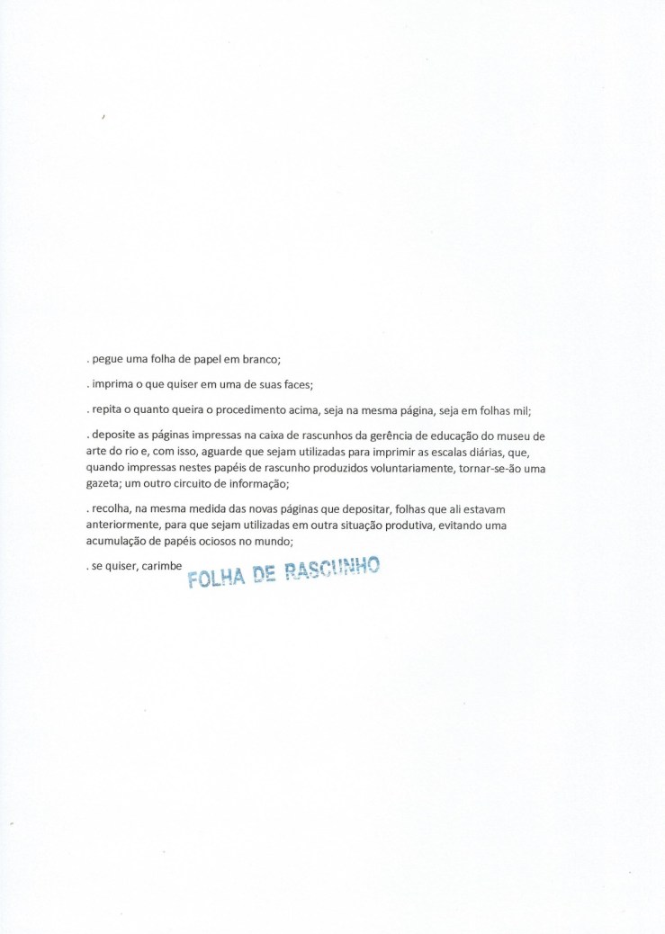 na gerência de educação do museu de arte do rio, são impressas algumas escalas diariamente, para que acompanhem a equipe durante a rotina de monitoramento dos pavilhões. como, em alguns momentos, usam as folhas de rascunho para que sejam impressas as escalas rotineiras, propus com essas instruções a criação de novos rascunhos, para a circulação de mensagens subversivas, cartas de amor, desenhos, zines e t c . entre nós.