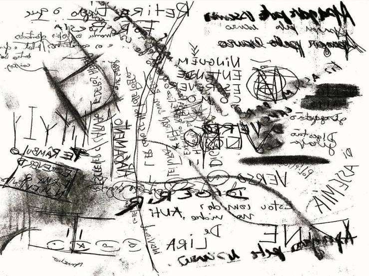 esta imagem foi utilizada como divulgação da oficina de antipoesia, que andré vargas e eu concebemos, e que foi realizada no museu de arte do rio, onde trabalhamos como educadores. criamos esta imagem rabiscando este papel com lápis, carvão e borracha, escaneando-o posteriormente e editando-a, agora como esta imagem, em detalhes básicos como espelhamento, brilho e saturação. este papel, onde começou esta imagem, tenho levado ao pavilhão de exposições do museu de arte do rio, e deixado lá com um lápis, uma borracha e um carvão. os visitantes intervém neste papel ora como se o rabiscassem em segredo, como se nele fossem anotações de alguém que o esqueceu ali, ora como se fosse um suporte pleno para suas expressões, usando toda sua extensão e suas duas faces. pouco usam a borracha neste papel e, conforme as informações que rabiscam se sobrepõem, uma de suas faces já não é a mesma que apresento nesta imagem. então mostro esta imagem na vontade de mostrar este papel, que, em sua mutação, nunca poderia doar à vista aqui. mas ontem, dezenove do um, uma visitante levou este papel, e resta esta imagem, e este papel é outra coisa.