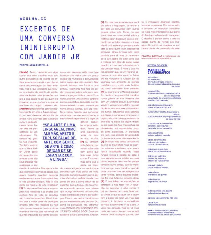 [Jandir] Tenho pensado em algo como arte sem trabalho, mas sob outra perspectiva: do escrito de artista, esse texto que dá a ver não só certa documentação do feito artístico, mas o que antecede sua feitura, os estados de espírito do artista, suas vacilações, suas projeções sobre o que aquilo irá ser ou quem irá impactar, o que mudou e o que se manteve do projeto primeiro etc.