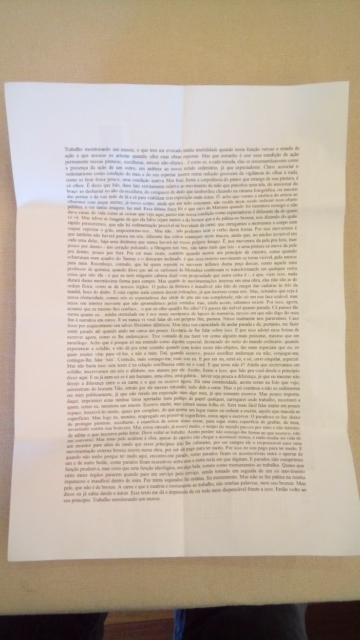 Trabalho monitorando um museu, o que tem me evocado minha imobilidade quando nesta função versus o estado de ação a que associo os artistas quando olho suas obras expostas. Mas que estranho é crer essa condição de ação permanente nessas pinturas, esculturas, nesses não-objetos… é como se, a cada mirada, elas se ressemantizassem como a presença da ação de um outro, em antítese ao nosso estado sedentário, já que espectadores. Claro: associar o sedentarismo como condição do meu e do seu espectar incorre numa redução grosseira da vigilância do olhar à nada, como se fruir fosse pouco, uma condição inativa. Mas fruir, frente a corpulência do pintor que emerge de sua pintura, é só olhos. É disso que falo, dum fato estritamente relativo ao movimento da mão que pincelou uma tela, do tensionar do braço ao desbastar no alto da escultura, do compasso do dedo que tamborilou clicando na câmera fotográfica, ou mesmo das pernas e da voz indo de lá a cá para viabilizar esta exposição onde estou. Ó: acho que vemos a cinética do artista ao olharmos suas peças inertes; já nosso corpo, ainda que em ação constante, não reside deste modo indicial num objeto público, e ver tantas imagens faz mal. Essa última frase foi o que ouvi da Mariana quando foi monitora comigo e não dava sinais de vida como as coisas que vejo aqui; penso que nossa condição como espectadores é diferente da de quem só vê. Mas talvez as imagens de que ela falou sejam menos a do bronze que a da pátina no bronze, nos dizendo do quão rápido pereceremos, que não há sedimentação possível na brevidade da carne, que enrugamos e morremos o corpo sem sequer suportar o grão, empoeirarmo-nos… Mas não… não podemos usar o verbo desta forma. Por nos movermos é que também não haverá poeira em nós, diferente das coisas estanques neste museu, ainda que, no núcleo invisível em cada uma delas, haja uma dinâmica que nunca haverá no nosso próprio âmago. É, nos movemos da pele pra fora, mas pouco por dentro – um coração pulsando, a filtragem nos rins, não tanto mais que isto – e uma pintura se move da pele pra dentro, pouco por fora. Pra ser mais exato, somente quando ocorre um princípio de sinistro, como quando esbarraram num quadro do Taunay e o deixaram inclinado, é que esse externo movimento se torna visível, pelo menos para mim. Reconheço, contudo, que há quem espreite os moveres ínfimos duma peça dessas, como aquele meu professor de química, quando disse que até os carbonos da Monalisa continuam se transformando em qualquer outra coisa que não ela – e que eu nem ninguém saberia dizer com propriedade que outra coisa é -, e que, visto isso, nada durará duma mesmíssima forma para sempre. Mas quanto às movimentações internas em uma obra, elas não são as de ordem física, como as de nossos órgãos. O pulso da madeira é inaudível; não falo do ranger das cadeiras às três da manhã, hora do diabo. E seus cupins nada sentem dessas pulsações, já que morrem como nós. Mas, estranho que seja à nossa efemeridade, somos nós os espectadores das obras de arte em sua completude; não só em sua face estável, mas nesse seu interior movente que não apreendemos pelos sentidos mas, ainda assim, sabemos existir. Por isso, agora, assumo que eu mesmo fico confuso… o que eu olho quando lhe olho? Cê parece tão móvel quanto parada. Cê parece tão eterna quanto eu… minha eternidade me é nos meus momentos de lapsos de memória, nesses em que não digo do meu fim à narrativa em curso. E eu nunca vi você falar de seu próprio fim, pintura. Nisso realmente nos parecemos. Caso fosse por esquecimento seu talvez fôssemos idênticos. Mas essa sua capacidade de andar parada e de, portanto, me fazer sentir parado até quando ando me cansa um pouco. Gostaria de lhe falar sobre isso. E por isso adotei essa forma de escrever agora, como se lhe endereçasse. Tive vontade de me fazer ver como alguém mais próximo, mesmo que em monólogo. Acho que é porque só me entendo como alguém especial, destacado do resto do mundo ordinário, quando experiencio a solidão, e não dá pra estar sozinho quando com todos esses não-objetos, tão mais especiais que eu, os quais muites vêm para vê-los, e não a mim. Daí, quando escrevo, posso escolher endereçar ou não; conjugar-me, conjugar-lhe, falar ‘nós’. Contudo, mais conjugo-me; mais sou eu. E por ser eu, serei só, e só, serei singular, especial. Mas não basta isso: este texto é na relação conflituosa entre eu e você. E que texto não é? Ainda que escrevamos em solidão, inscrevemos em nós o alfabeto; nos atamos por ele. Aceito, frente a isso, que falo pra você desde o princípio disso aqui. E eu já nem sei se é um humano, uma obra, uma galeria… talvez seja pouca a diferença, já que eu mesmo não desejo a diferença entre o eu carne e o que eu escrevo agora. Há uma continuidade, assim como na foto que vejo, autorretrato do homem Tião, retrato por ele mesmo retratado; tudo dele a carne. Mas o pó continua a não se sedimentar em mim publicamente, já que não resido em exposição num algo meu, já que somente escrevo. Mas pouco importa: daqui, imprimirei estas minhas letras apertadas num pedaço de papel qualquer, carregarei onde trabalho, mostrarei a quem, como eu, monitora um museu. Escrevo muito, mas caberá numa folha só. Será mais fácil falar muito em pouco espaço, inscrevê-lo muito, quase por completo, do que querer um lugar maior ou reduzir a escrita, aquilo que macula as superfícies. Mas logo eu, monitor, empregado em preservar superfícies, estou aqui a escrever. O paradoxo se faz: deixo de proteger pinturas, esculturas, a superfície de coisas como essas, para sujar outra superfície de grafite, de tinta, investindo contra sua brancura. Mas estou cansado, já escrevi muito, o tempo do mundo passou por mim e não termino de editar o que inscrevo pelas letras. Devo voltar ao trabalho. 