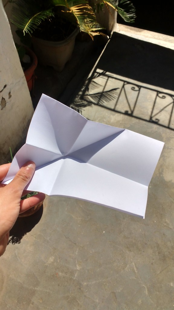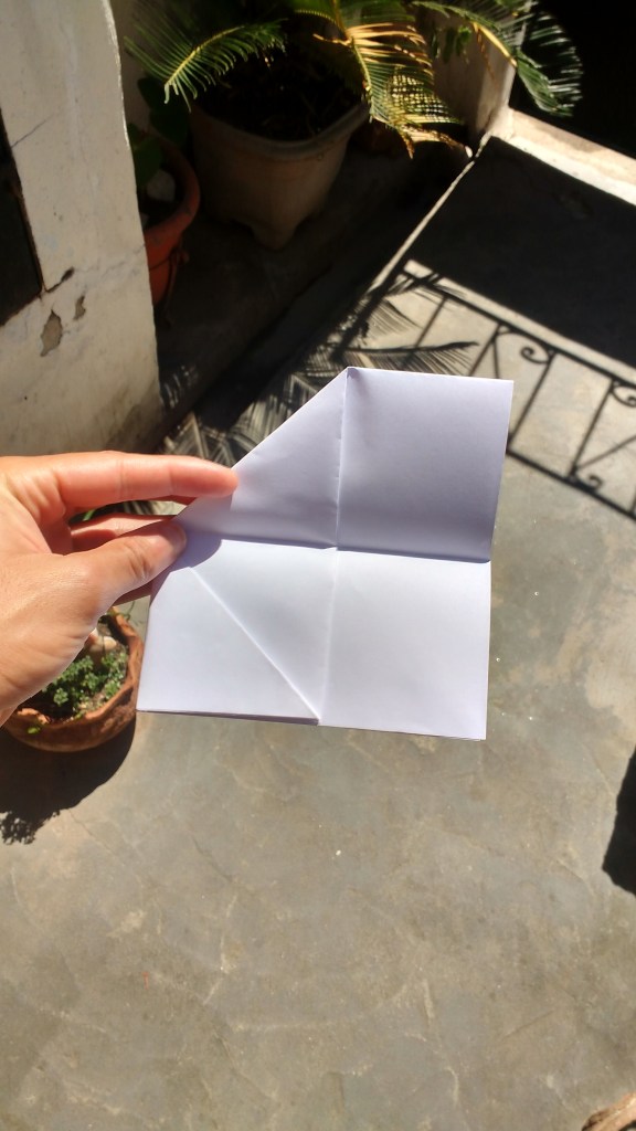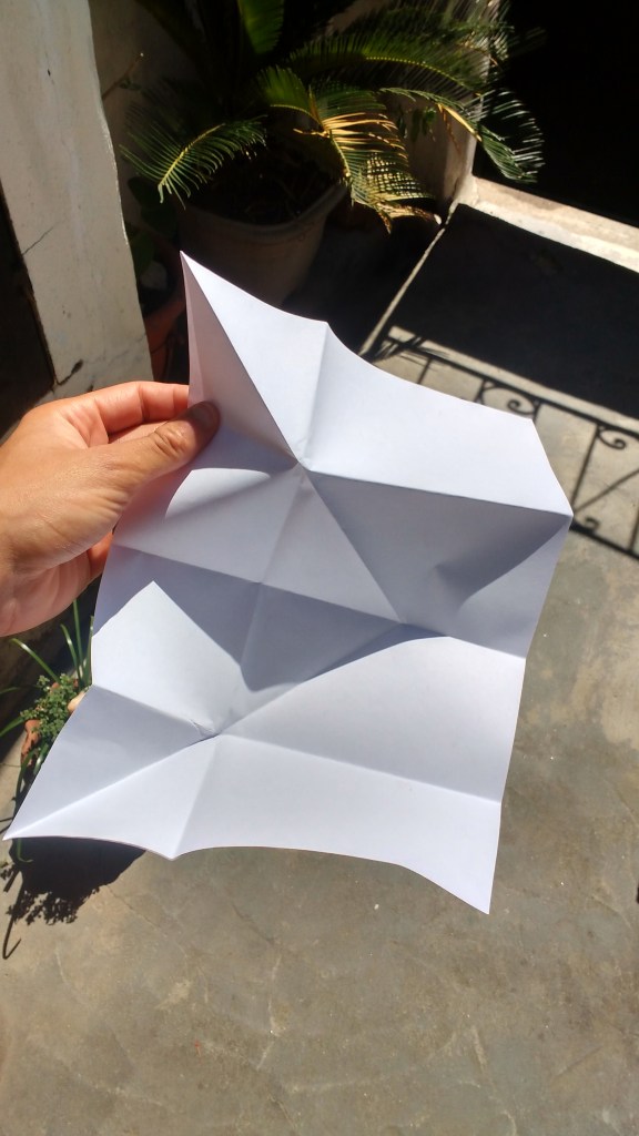 Você me fez saber que o origami é outra geometria ancestral a ser mencionada. Foi te lendo que aprendi que, por aqui, o origami veio tanto da influência de imigrantes japoneses quanto da de espanhóis dobradores de papel, aportados na Argentina. Ao te ler, fui esclarecido por seu conhecimento, sua larga prática. Então escrevo a você, pensando que não gostaria de ser visto como um origamista amador, na ocasião em que você abrir meu envelope e visualizar simples dobraduras, num sulfite igualmente simplório. Aqui, portanto, envio um e-mail com fotos da carta, para dizer, quando você recebê-la – e caso já não tenha a recebido -, que não tenho qualquer pretensão origamista. Trata-se somente de mais uma, diminuta, dentre tantas e isoladas ocorrências geométricas nesta porção do planeta, e que quis compartilhar com pessoas de fora da minha família.