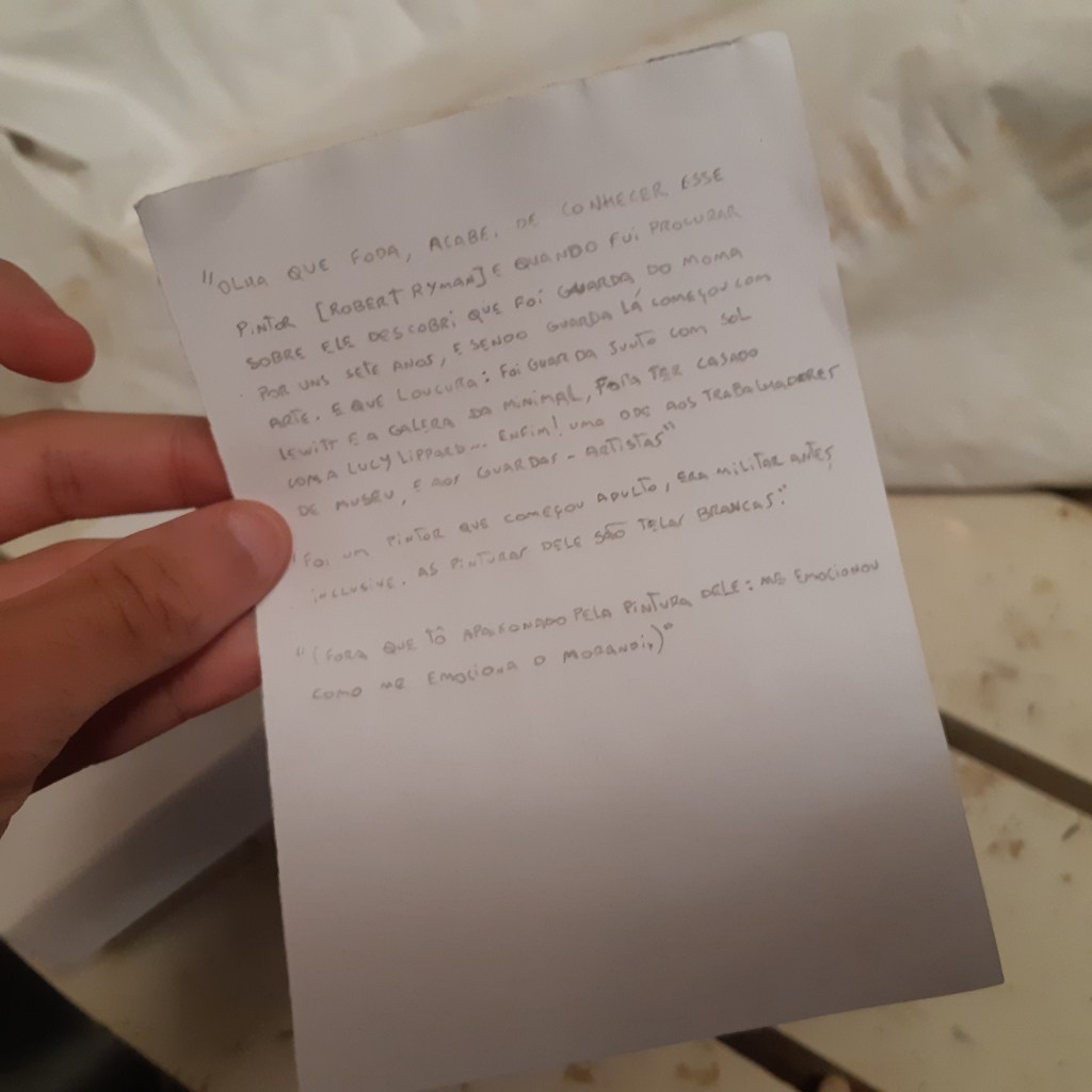 “olha que foda, acabei de conhecer esse pintor [robert ryman] e quando fui procurar sobre ele descobri que foi guarda do moma por uns sete anos, e sendo guarda lá começou com arte. e que loucura: foi guarda junto com sol lewitt e a galera da minimal, fora ter casado com a lucy lippard…. enfim! uma ode aos trabalhadores de museu, e aos guardas-artistas”