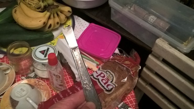 Agora entendi, está faca quebrada que Jandir gostava, espalha melhor as coisas no pão, parece uma espátula. Herança que não tem valor real.