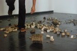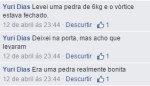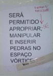 COMUNICADO: É PERMITIDO APROPRIAR, MANIPULAR E INSERIR PEDRAS NESTE ESPAÇO. GRATO, JANDIR JR. | 2015 | Ocupação realizada no Espaço Vórtice, na EBA/UFRJ | De cima para baixo: registros fotográficos por Jandir Jr. e Mônica Coster, comentários no http://facebook.com por Yuri Dias quatro dias após o término da ocupação e intervenção anônima em cartaz de divulgação afixado em um mural.