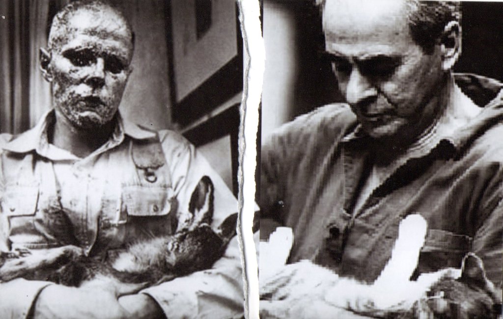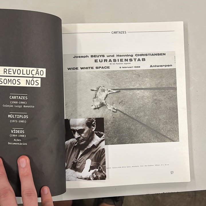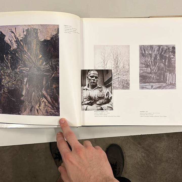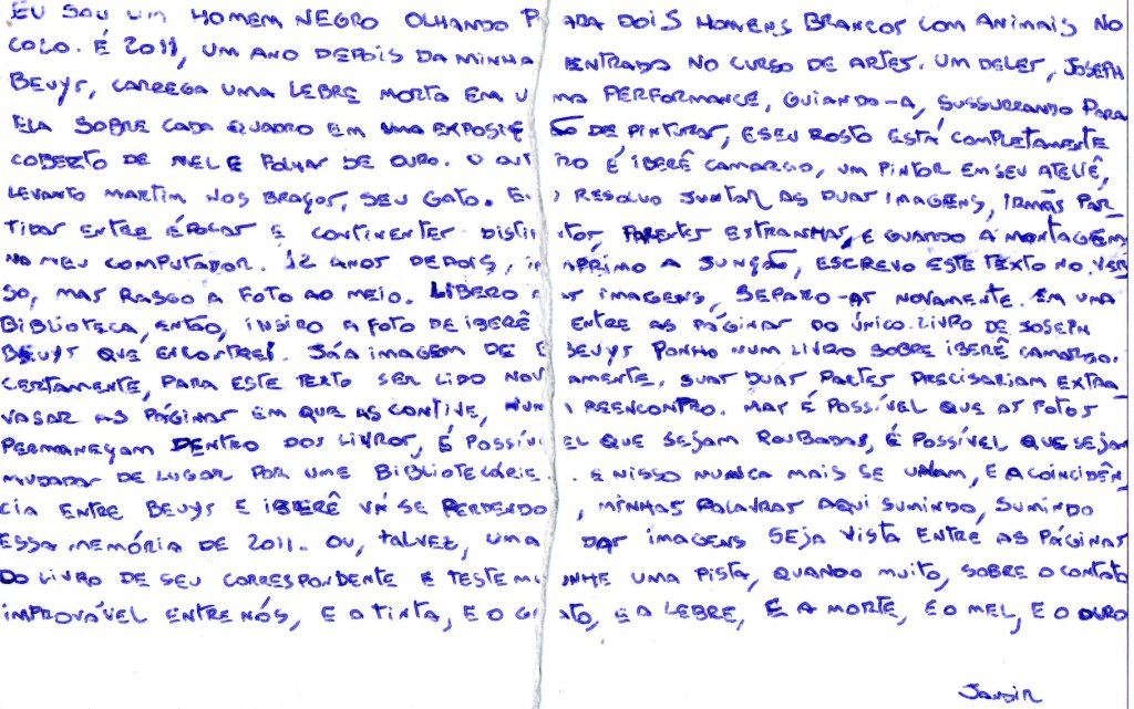 Eu sou um homem negro olhando para dois homens brancos com animais no colo. É 2011, um ano depois da minha entrada no curso de artes. Um deles, Joseph Beuys, carrega uma lebre morta em uma performance, guiando-a, sussurrando para ela sobre cada quadro em uma exposição de pinturas, e seu rosto está completamente coberto de mel e folhas de ouro. O outro é Iberê Camargo, um pintor em seu ateliê, levando Martim nos braços, seu gato. Eu resolvo juntar as duas imagens, irmãs partidas entre épocas e continentes distintos, parentes estranhas, e guardo a montagem no meu computador. 12 anos depois, imprimo a junção, escrevo este texto no verso, mas rasgo a foto ao meio. Libero as imagens, separo-as novamente. Em uma biblioteca, então, insiro a foto de Iberê entre as páginas do único livro de Joseph Beuys que encontrei. Já a imagem de Beuys ponho num livro sobre Iberê Camargo. Certamente, para este texto ser lido novamente, suas duas partes precisariam extravasar as páginas em que as contive, num reencontro. Mas é possível que as fotos permaneçam dentro dos livros, é possível que sejam roubadas, é possível que sejam mudadas de lugar por ume bibliotecárie. E nisso nunca mais se unam, e a coincidência entre Beuys e Iberê vá se perdendo, minhas palavras aqui sumindo, sumindo essa memória de 2011. Ou, talvez, uma das imagens seja vista entre as páginas do livro de seu correspondente e testemunhe uma pista, quando muito, sobre o contato improvável entre nós, e a tinta, e o gato, e a lebre, e a morte, e o mel, e o ouro.