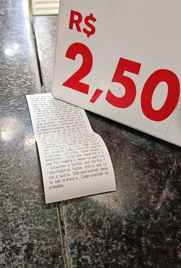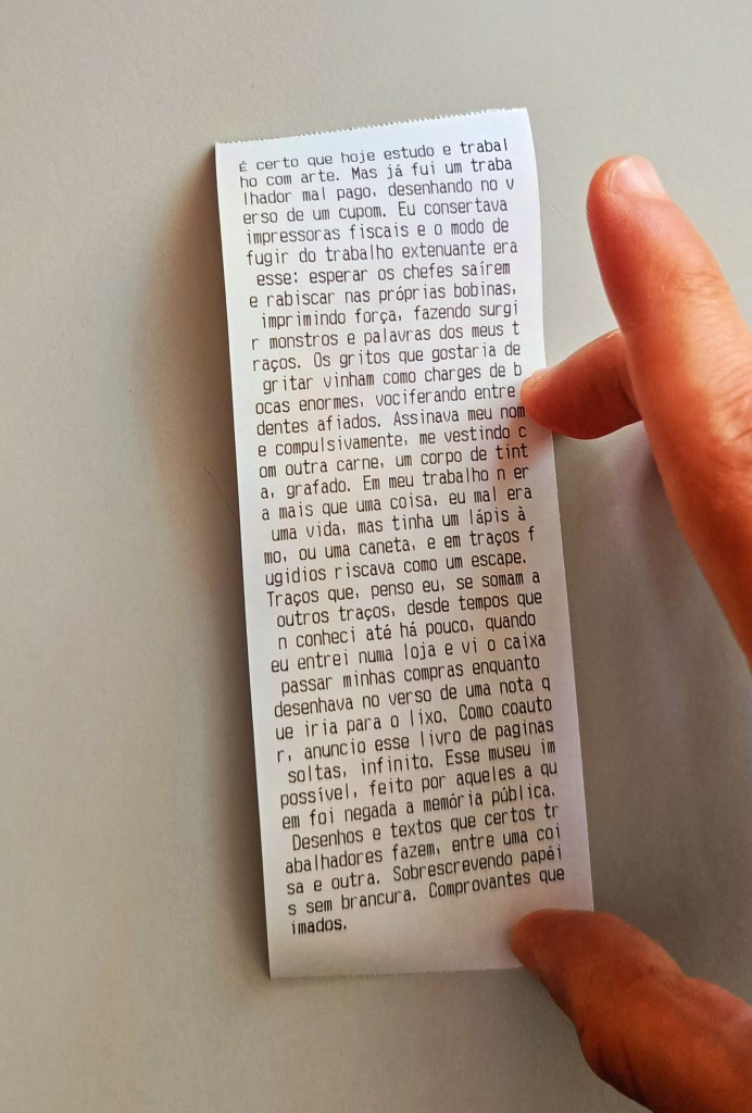 É certo que hoje estudo e trabalho com arte. Mas já fui um trabalhador mal pago, desenhando no verso de um cupom. Eu consertava impressoras fiscais e o modo de fugir do trabalho extenuante era esse: esperar os chefes saírem e rabiscar nas próprias bobinas, imprimindo força, fazendo surgir monstros e palavras dos meus traços. Os gritos que gostaria de gritar vinham como charges de bocas enormes, vociferando entre dentes afiados. Assinava meu nome compulsivamente, me vestindo com outra carne, um corpo de tinta, grafado. Em meu trabalho não era mais que uma coisa, eu mal era uma vida, mas tinha um lápis à mão, ou uma caneta, e em traços fugidios riscava como um escape. Traços que, penso eu, se somam a outros traços, desde tempos que não conheci até há pouco, quando eu entrei numa loja e vi o caixa passar minhas compras enquanto desenhava no verso de uma nota que iria para o lixo. Como coautor, anuncio esse livro de paginas soltas, infinito. Esse museu impossível, feito por aqueles a quem foi negada a memória pública. Desenhos e textos que certos trabalhadores fazem, entre uma coisa e outra. Sobrescrevendo papéis sem brancura. Comprovantes queimados.