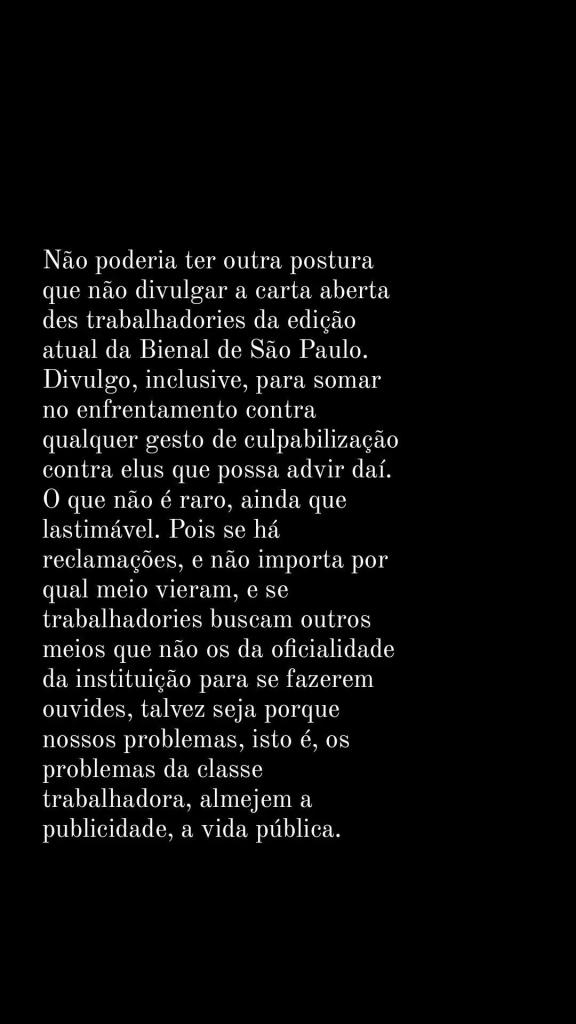 Não poderia ter outra postura que não divulgar a carta aberta des trabalhadories da edição atual da Bienal de São Paulo. Divulgo, inclusive, para somar no enfrentamento contra qualquer gesto de culpabilização contra elus que possa advir daí. O que não é raro, ainda que lastimável. Pois se há reclamações, e não importa por qual meio vieram, e se trabalhadories buscam outros meios que não os da oficialidade da instituição para se fazerem ouvides, talvez seja porque nossos problemas, isto é, os problemas da classe trabalhadora, almejem a publicidade, a vida pública.