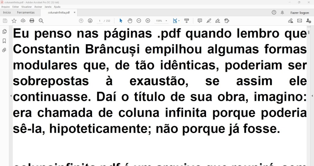 Eu penso nas páginas .pdf quando lembro que Constantin Brâncuși empilhou algumas formas modulares que, de tão idênticas, poderiam ser sobrepostas à exaustão, se assim ele continuasse. Daí o título de sua obra, imagino: era chamada de coluna infinita porque poderia sê-la, hipoteticamente; não porque já fosse.