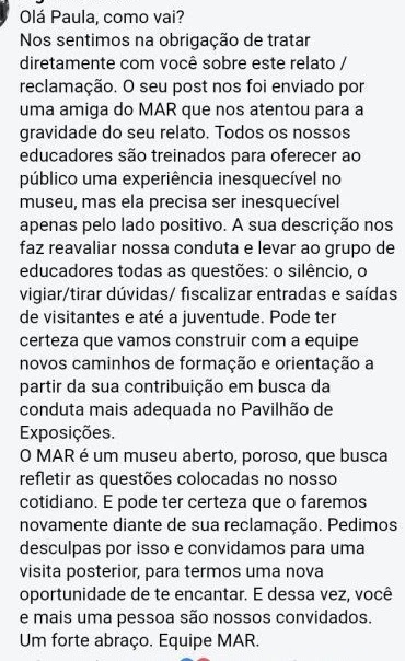 O museu, publicamente, via Facebook, acolheu Paula. Enviou condolências, ofertou uma visita gratuita e disse que ia treinar melhor a equipe. Tudo numa mensagem escrita, inclusive, do perfil pessoal de uma funcionária da comunicação, numa proximidade estranhíssima.