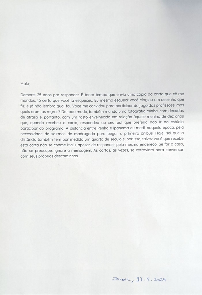 Demorei 25 anos pra responder. É tanto tempo que envio uma cópia da carta que cê me mandou, tô certo que você já esqueceu. Eu mesmo esqueci: você elogiou um desenho que fiz, e já não lembro qual foi. Você me convidou para participar do jogo das profissões, mas quais eram as regras? De todo modo, também mando uma fotografia minha, com décadas de atraso e, portanto, com um rosto envelhecido em relação àquele menino de dez anos que, quando recebeu a carta, respondeu ao seu pai que preferia não ir ao estúdio participar do programa. A distância entre Penha e Ipanema eu medi, naquela época, pela necessidade de sairmos de madrugada para pegar o primeiro ônibus. Hoje, sei que a distância também tem por medida um quarto de século e, por isso, talvez você que recebe esta carta não se chame Malu, apesar de responder pelo mesmo endereço. Se for o caso, não se preocupe, ignore a mensagem. As cartas, às vezes, se extraviam para conversar com seus próprios descaminhos.
