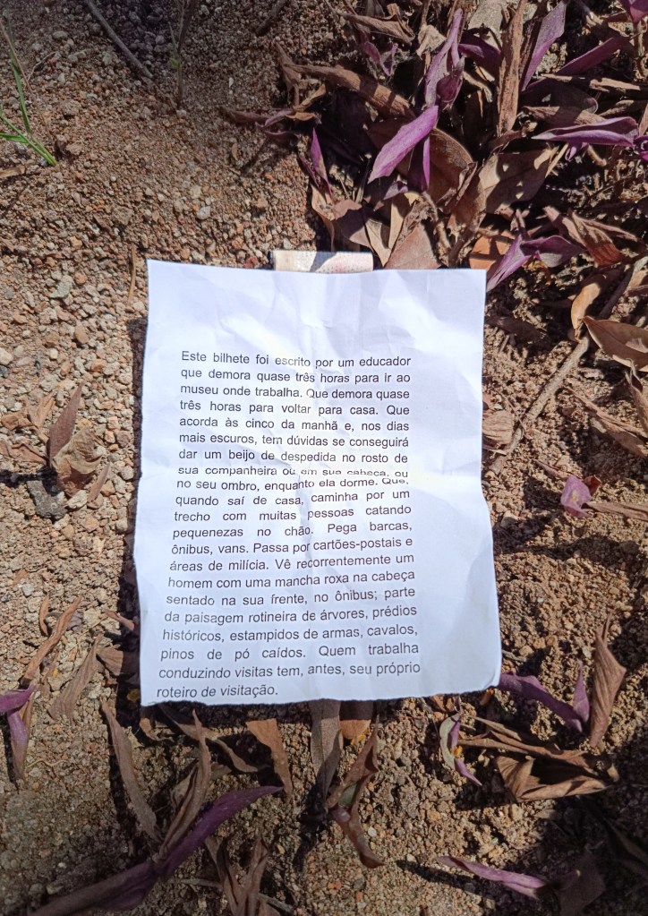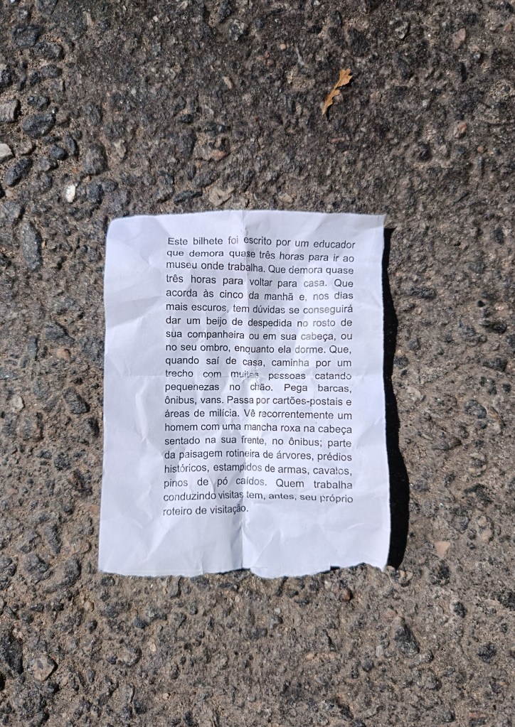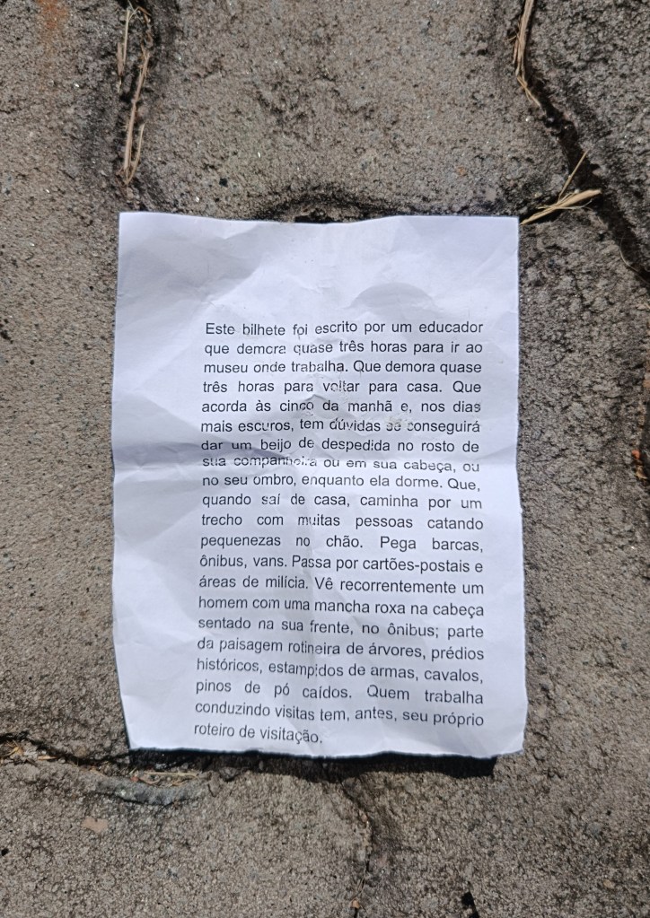 Este bilhete foi escrito por um educador que demora quase três horas para ir ao museu onde trabalha. Que demora quase três horas para voltar para casa. Que acorda às cinco da manhã e, nos dias mais escuros, tem dúvidas se conseguirá dar um beijo de despedida no rosto de sua companheira ou em sua cabeça, ou no seu ombro, enquanto ela dorme. Que, quando sai de casa, caminha por um trecho com muitas pessoas catando pequenezas no chão. Pega barcas, ônibus, vans. Passa por cartões-postais e áreas de milícia. Vê recorrentemente um homem com uma mancha roxa na cabeça sentado na sua frente, no ônibus; parte da paisagem rotineira de árvores, prédios históricos, estampidos de armas, cavalos, pinos de pó caídos. Quem trabalha conduzindo visitas tem, antes, seu próprio roteiro de visitação.
