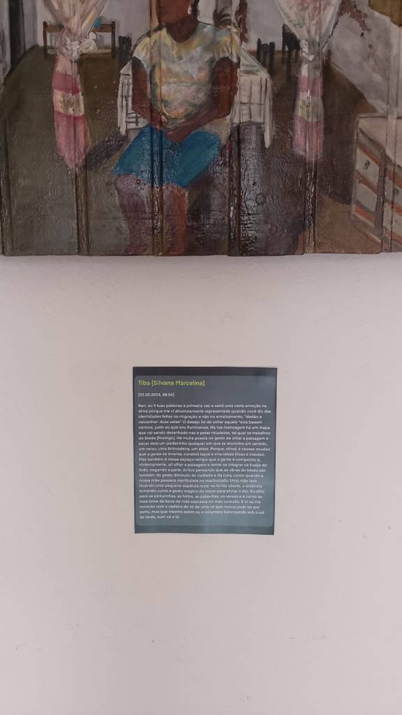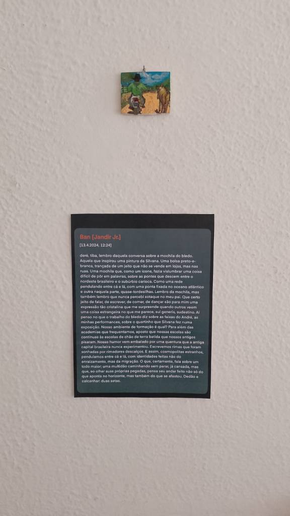 Ban, eu li tuas palavras a primeira vez e senti uma certa emoção na alma porque me vi absolutamente representada quando você diz das identidades feitas na migração e não no enraizamento, “dedão e calcanhar: duas setas”. O desejo foi de soltar aquele *orra beeem carioca, justo eu que sou fluminense. Na tua mensagem há um mapa que vai sendo desenhado nas e pelas miudezas, tal qual os trabalhos do bledo [Rodrigo]. Há muita poesia no gesto de olhar a paisagem e sacar dela um pedacinho qualquer em que se encontre um sentido, um verso, uma brincadeira, um afeto. Porque, afinal, é nesses miúdos que a gente se inventa, constrói laços e cria raízes (fixas e móveis). Mas também é nesse espaço-tempo que a gente é compelido a, violentamente, só olhar a paisagem e tentar se integrar na ilusão do todo, negando a parte. Aí fico pensando que as obras do bledo são também do gesto diminuto do cuidado e da cura, como quando a nossa mãe passava merthiolate no machucado. Uma mão leve fazendo uma pequena espátula roçar na ferida aberta, a ardência tomando conta e gesto mágico do sopro para aliviar a dor. Eu olho para as pinturinhas, as fotins, as palavritas, os versos e é como se essa brisa da boca de mãe soprasse no meu coração. E aí eu me conecto com a cadeira de vó de uma vó que nunca pude ter por perto, mas que mesmo assim eu a vislumbro balançando sob o sol da tarde, num cá e lá.
