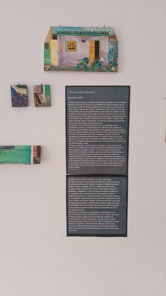 Na rasura, no rascunho, na garatuja e no descartar, assim como no interior de si, no interior do só e no interior que é só o interior daqui. Jogando com as palavras, andando e conversando o mais simples para o tempo passar amigo, como nós quatro faziamos de uma sala de exposição a outra, Bledo é um artista e educador dos espaços onde habita, sensível a todo entorno que entorna em grandes ondas de suor e frescor, no mar dos desconfortos e confrontos da vida, uma ilha.