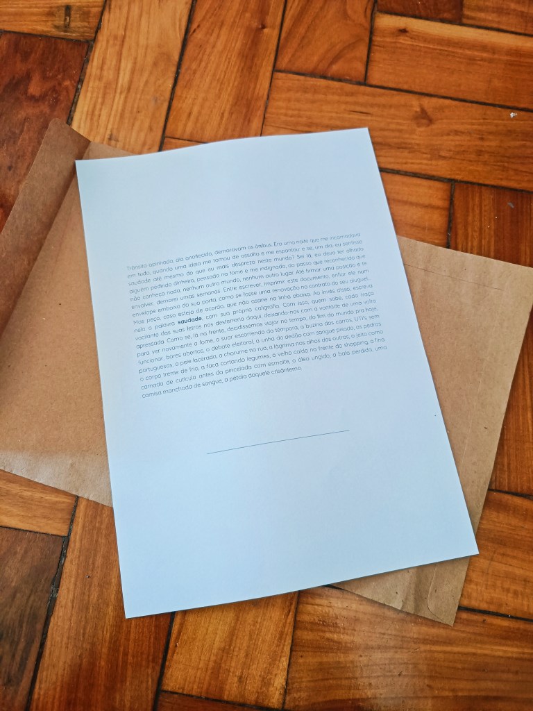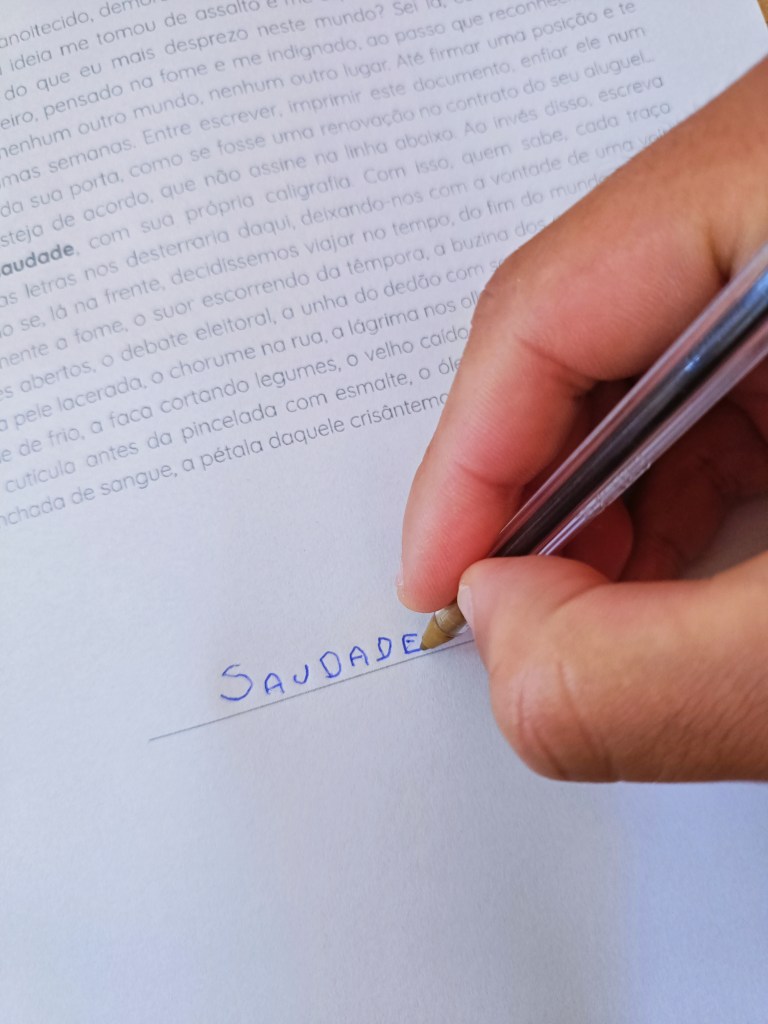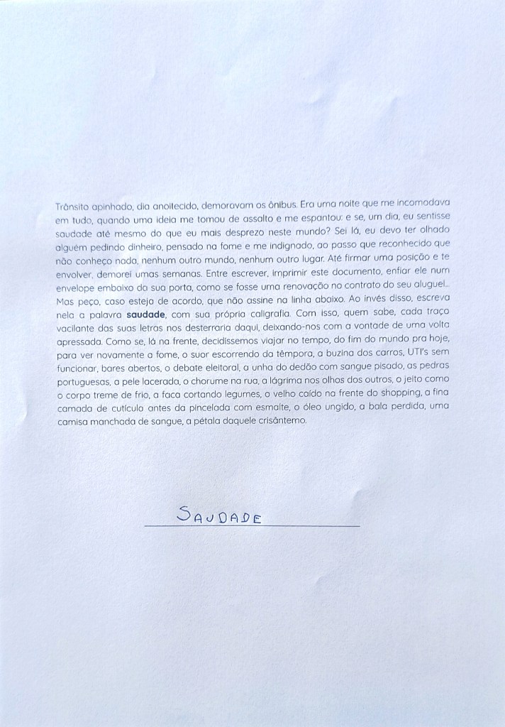 Trânsito apinhado, dia anoitecido, demoravam os ônibus. Era uma noite que me incomodava em tudo, quando uma ideia me tomou de assalto e me espantou: e se, um dia, eu sentisse saudade até mesmo do que eu mais desprezo neste mundo? Sei lá, eu devo ter olhado alguém pedindo dinheiro, pensado na fome e me indignado, ao passo que reconhecido que não conheço nada, nenhum outro mundo, nenhum outro lugar. Até firmar uma posição e te envolver, demorei umas semanas. Entre escrever, imprimir este documento, enfiar ele num envelope embaixo da sua porta, como se fosse uma renovação no contrato do seu aluguel… Mas peço, caso esteja de acordo, que não assine na linha abaixo. Ao invés disso, escreva nela a palavra saudade, com sua própria caligrafia. Com isso, quem sabe, cada traço vacilante das suas letras nos desterraria daqui, deixando-nos com a vontade de uma volta apressada. Como se, lá na frente, decidíssemos viajar no tempo, do fim do mundo pra hoje, para ver novamente a fome, o suor escorrendo da têmpora, a buzina dos carros, UTI’s sem funcionar, bares abertos, o debate eleitoral, a unha do dedão com sangue pisado, as pedras portuguesas, a pele lacerada, o chorume na rua, a lágrima nos olhos dos outros, o jeito como o corpo treme de frio, a faca cortando legumes, o velho caído na frente do shopping, a fina camada de cutícula antes da pincelada com esmalte, o óleo ungido, a bala perdida, uma camisa manchada de sangue, a pétala daquele crisântemo.